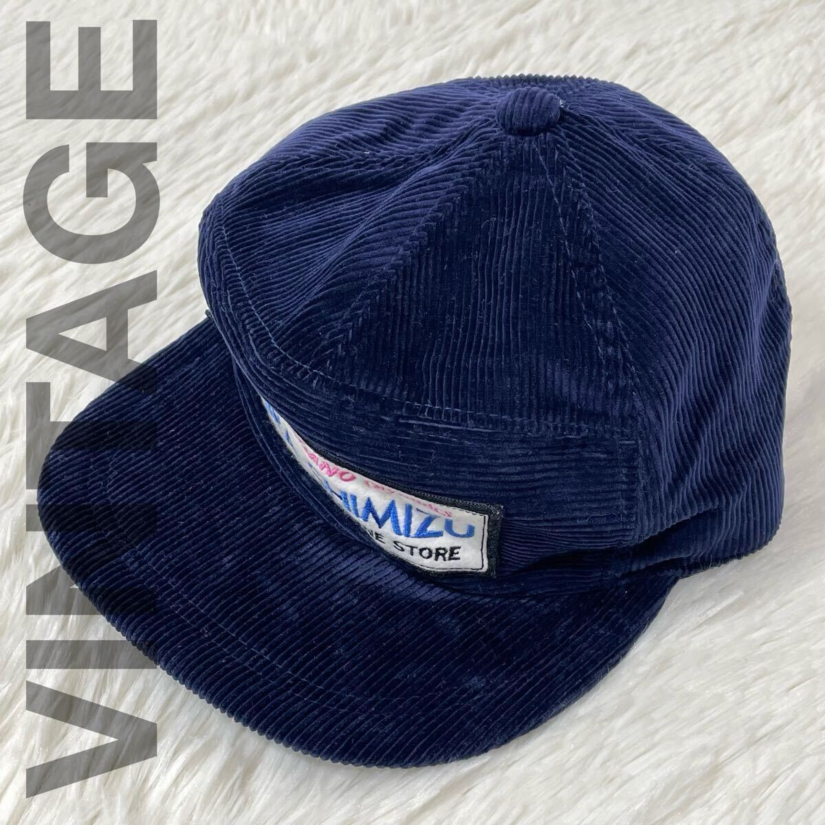 > 希少 清水アキラ 1998 長野オリンピック モノマネストア ロゴ ワッペン コーデュロイ ヴィンテージ キャップ 帽子 ネイビー CP053