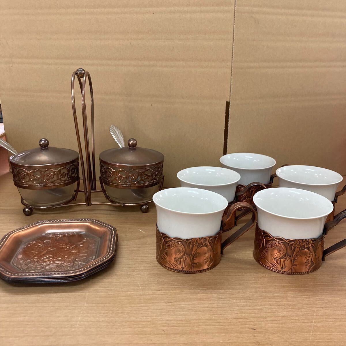 - K-27☆80サイズ☆ ビンテージ KARNAK カルナック エジプト画 銅 陶器 コースター セット アンティーク