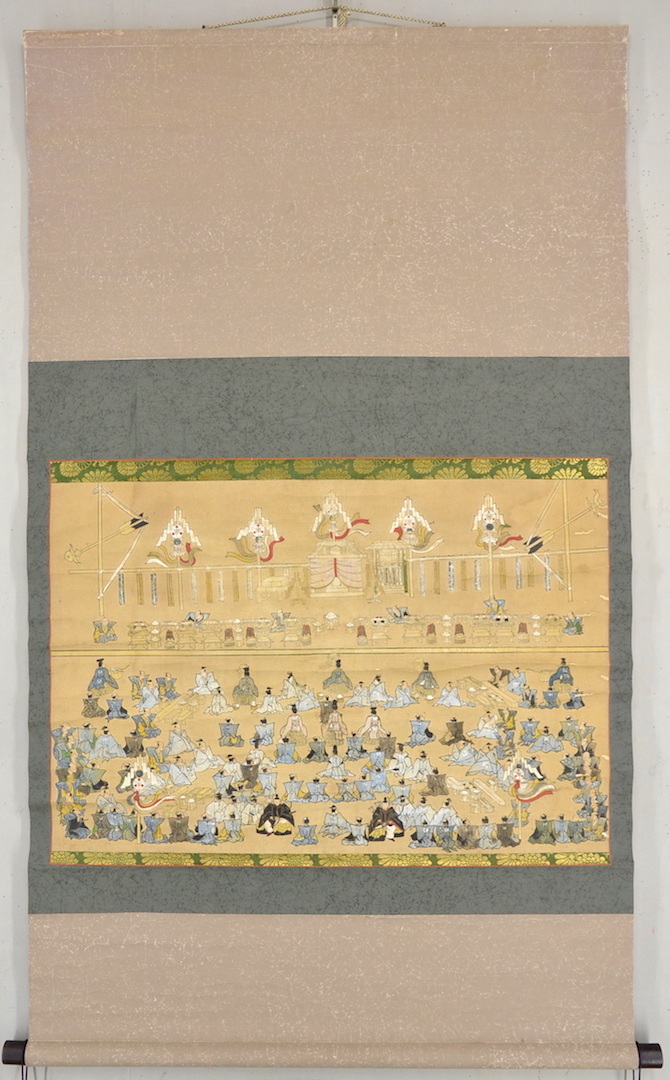 - 《模作》「江府浅草本願寺御堂御再建御普請御上棟御式絵図」 掛軸 木版 彩色 天明四年歳甲辰土月吉日 骨董 古美術 時代 9160-3805