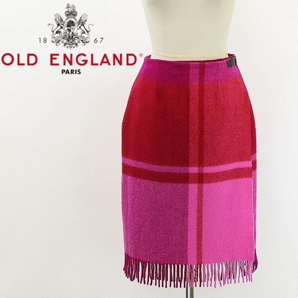 > 美品◆OLD ENGLAND オールド イングランド チェック柄 サイドベルト フリンジ ウール ラップ スカート UK8
