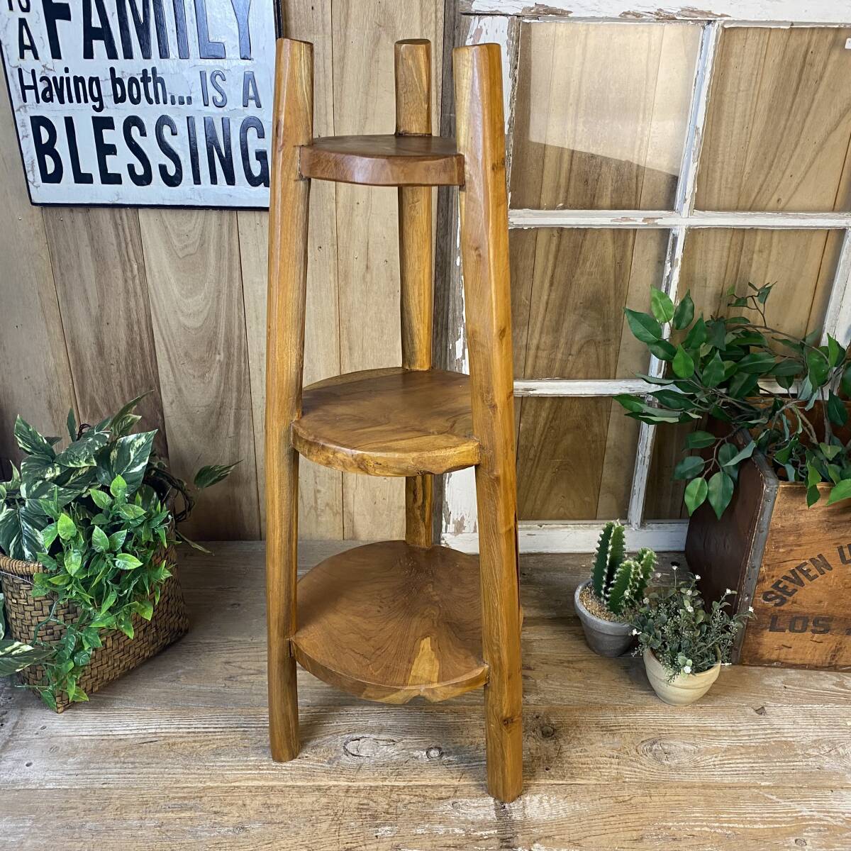 - 送料無料、オールドチーク天然無垢材三連ハイシェルフラック三段(34㎝×84㎝)木製飾り棚ナチュラルウッド置台花台アジアンインテリア