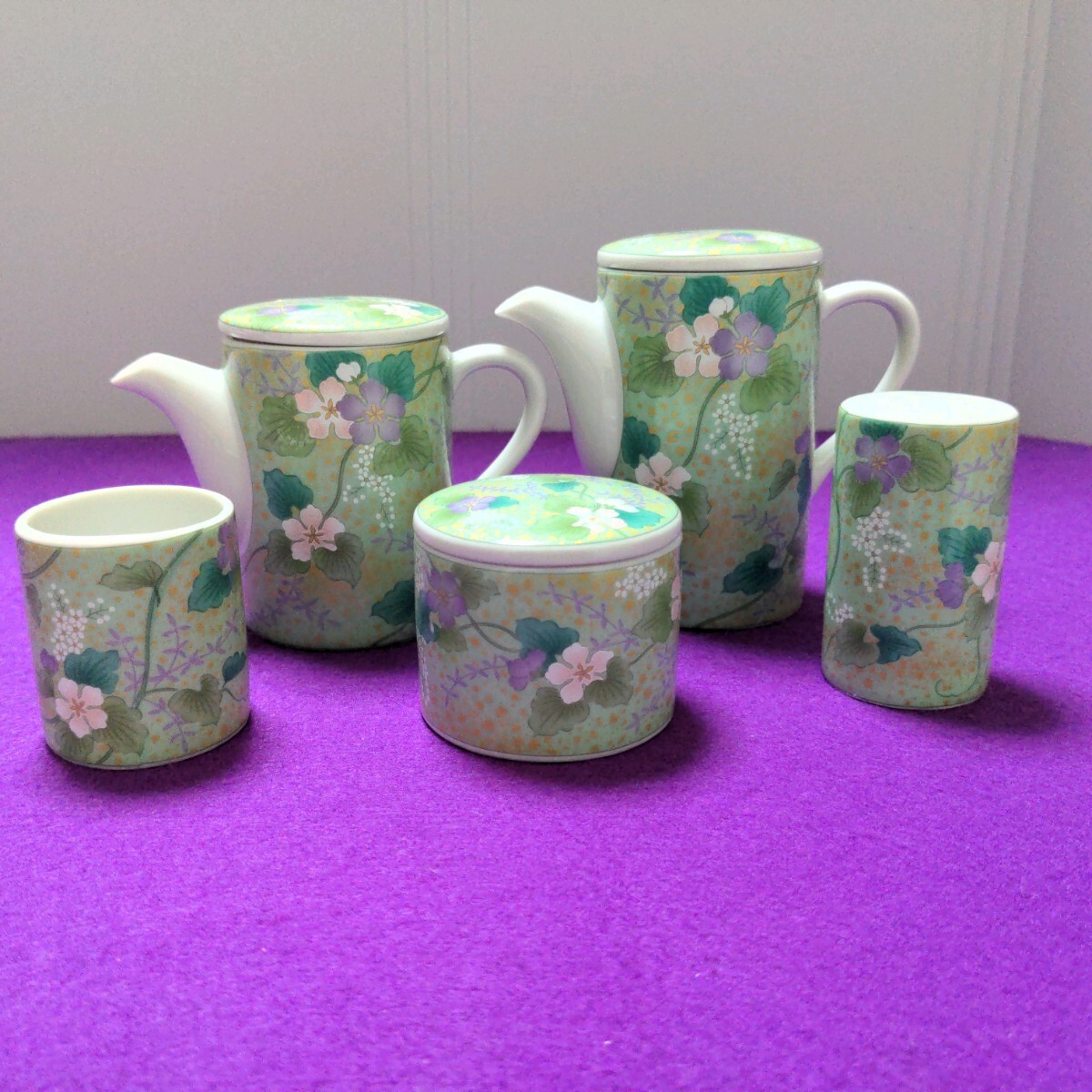 > 1-250113 友禅草花調味 5点 食器 卓上用品 セット 醤油さし 薬味入れ 塩調味料入れ 爪楊枝入れ 花柄 美しい グリーン系
