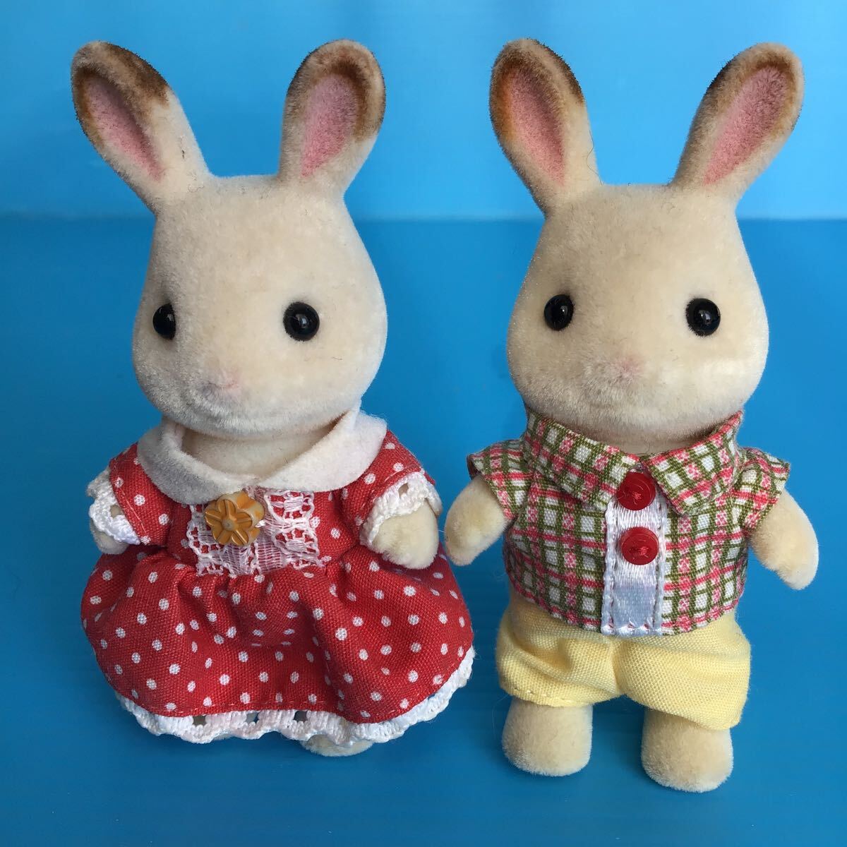> used おもちゃ 「 シルバニアファミリー ショコラうさぎ 女の子 男の子 2体 」人形と服のセットです / 説明書、外箱ありません