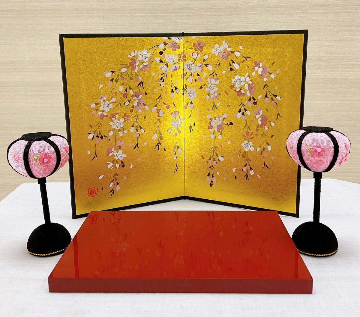 - お雛様小道具【雛台&桜金屏風 高さ15cm&ぼんぼり一対】3点セット ひな祭り お手持ちのお雛様とご一緒に 新品未使用品