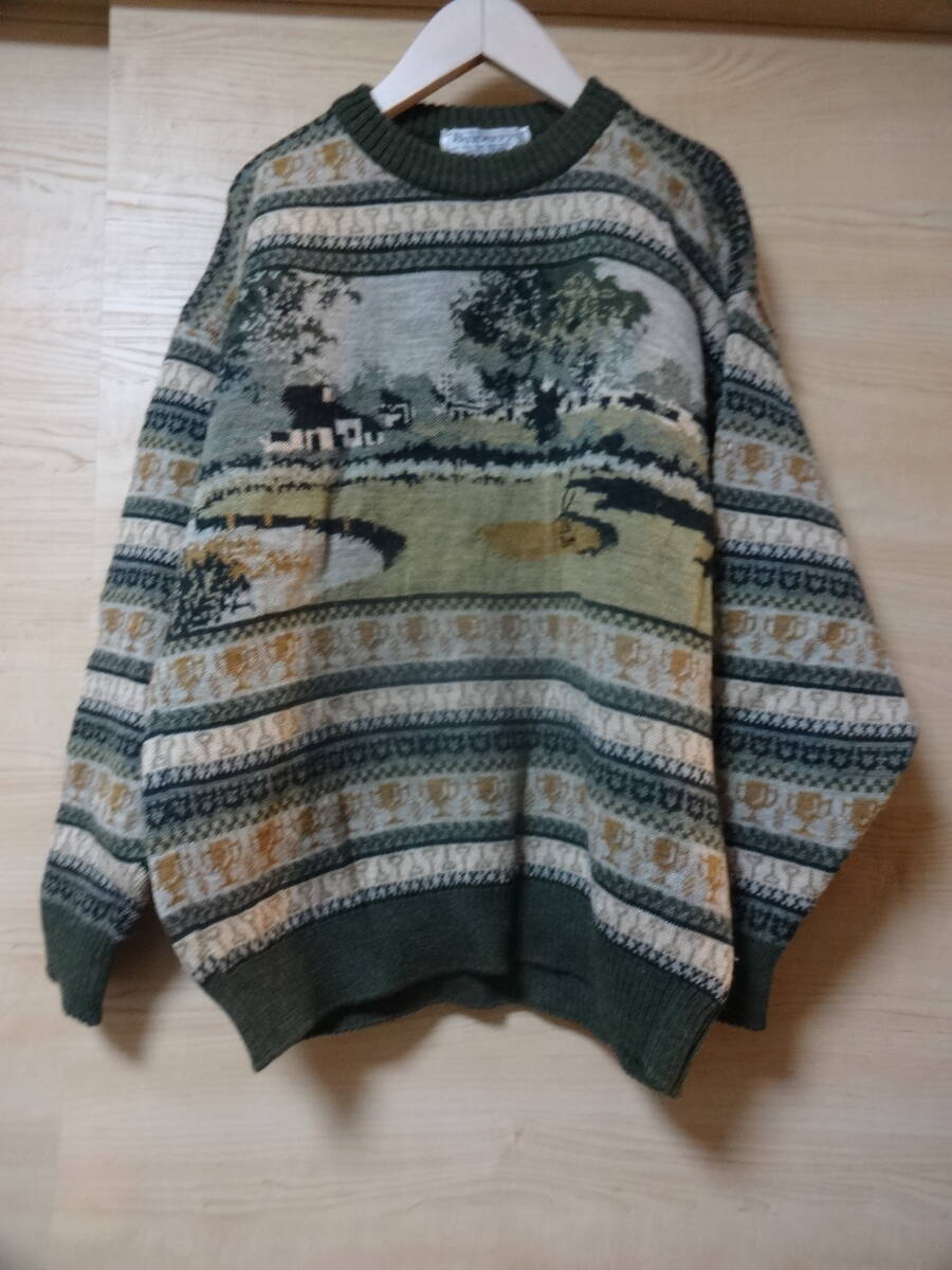 - BURBERRY 編み込み柄 丸首セーター A0250 グリーン系 刺繍 バーバリー U.K.製