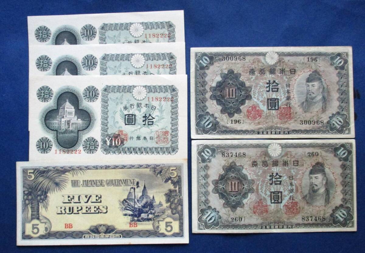 - 日本紙幣 議事堂10ピン札3枚・2次10円2枚美品・ビルマへ号5ルピ1枚 EE37 ピン札・美品です。 画像参照してください。