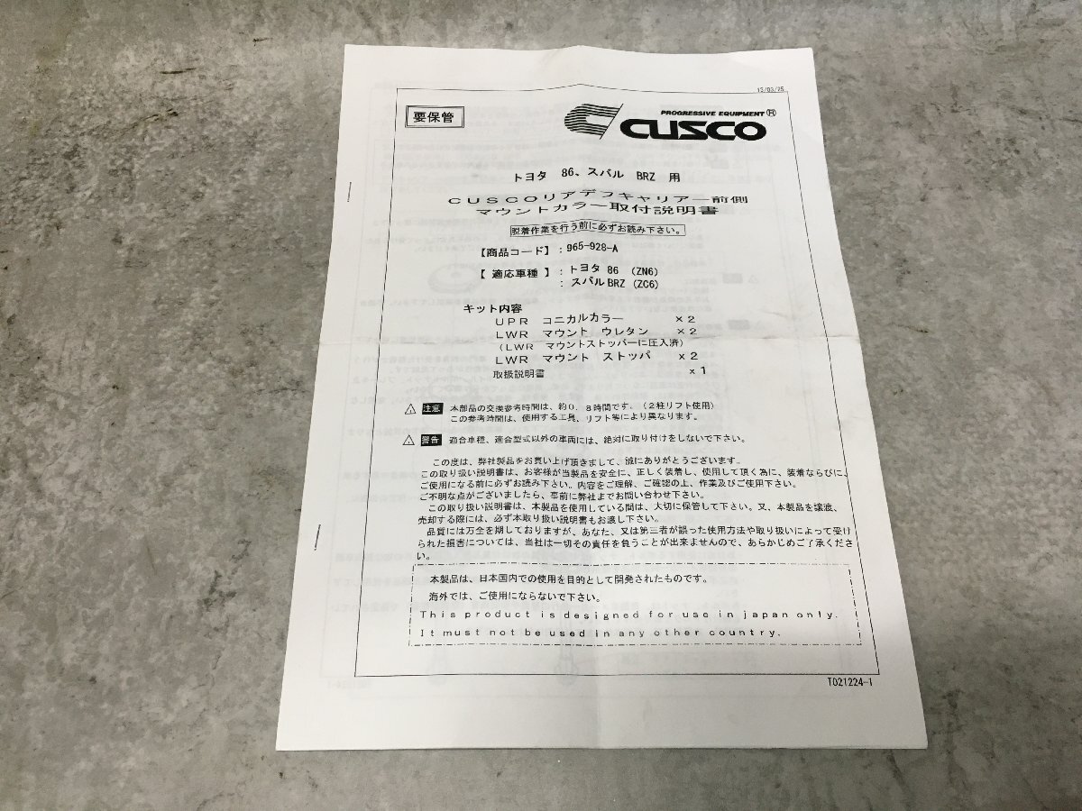 - ZN6 86(ZC6 BRZ)クスコ CUSCO リアデフキャリアー前側 マウントカラー取付説明書