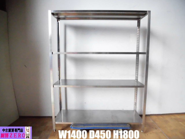 - 中古厨房 業務用 4段ラック ステンレス 収納棚 W1400×D450×H1800mm 調整脚+30mm 店舗 飲食店 キッチン 調理場