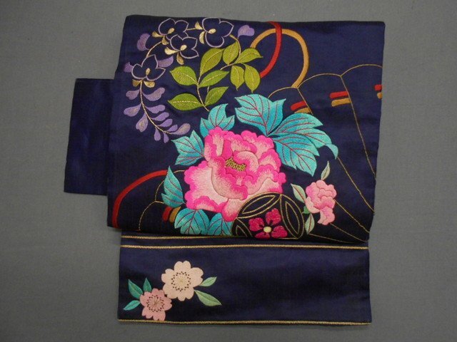 - 名古屋帯 [A21470] 刺繍 花 扇 長さ338cm 幅30cm 半幅15cm 古布 古裂 リメイク 材料 和服 衣装 リサイクル着物