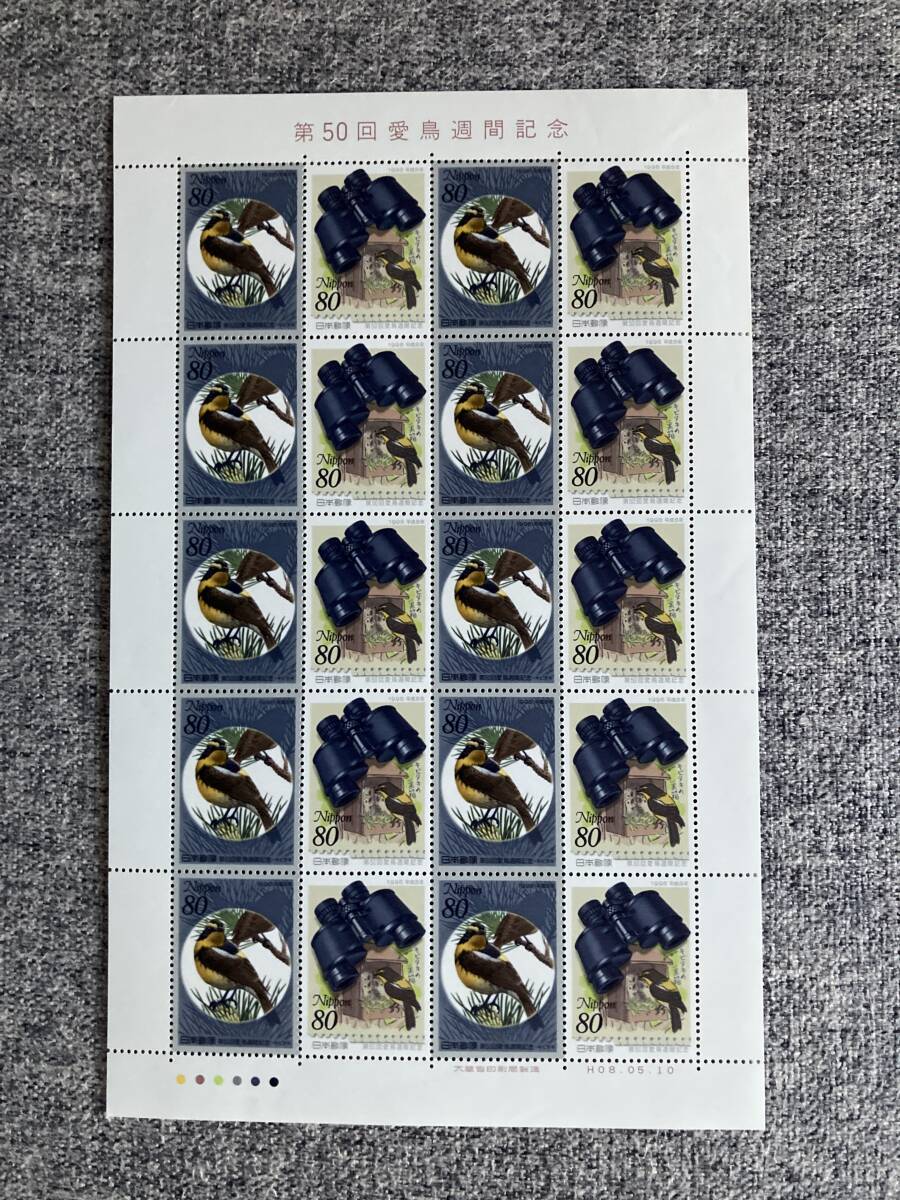 > ★未使用 第50回 愛鳥週間記念 キビタキ バードウオッチング 双眼鏡 1996年 平成8年 切手シート 80円 20枚 2種連刷 日本郵便