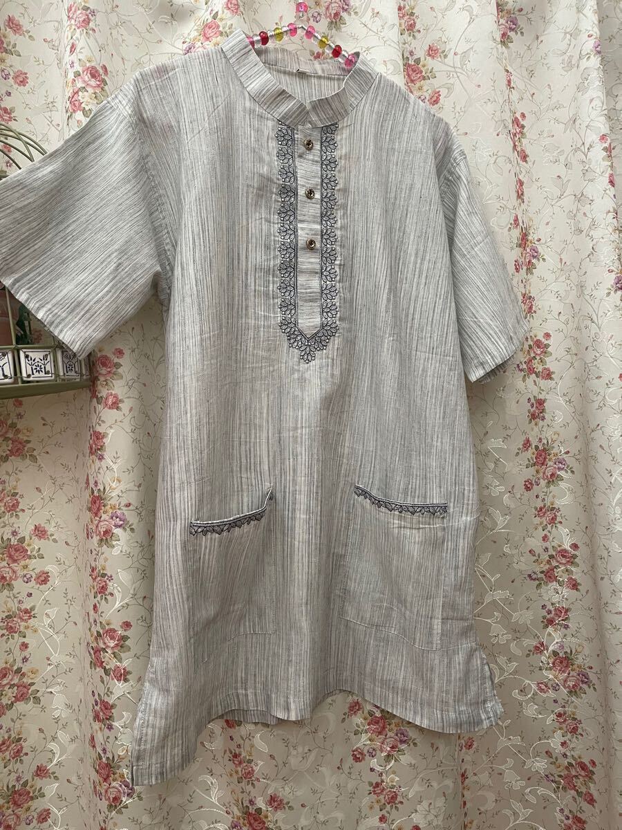 - グレー系 バンドカラー ロングシャツ L チュニック ハイネック
