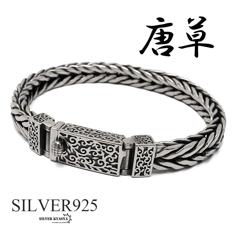 - シルバー925 唐草ブレスレット メンズ チェーンブレスレット 重厚 フォックステール フランコチェーン 燻し 金属アレルギー対応