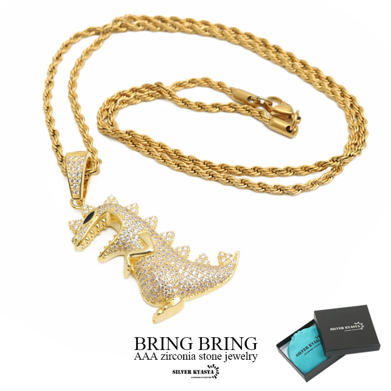 > 恐竜ネックレス ダイナソー パヴェ AAA 14k GP ペンダント トップ ロープチェーン ストリート ゴールド 専用BOX付属
