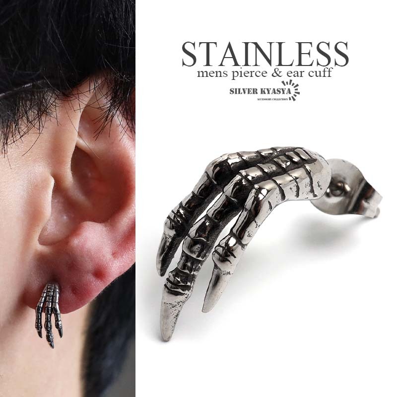 - ステンレス製 龍の手 ピアス ドラゴンピアス シルバー 燻し風 片耳1点 プチプラ メンズ 金アレ対応