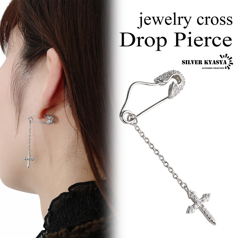 > パヴェ クロス 十字架 ドロップ ピアス 安全ピン セーフティピン シルバー 銀色 ダイヤ B系 ブリンブリン 片耳 1点 20G