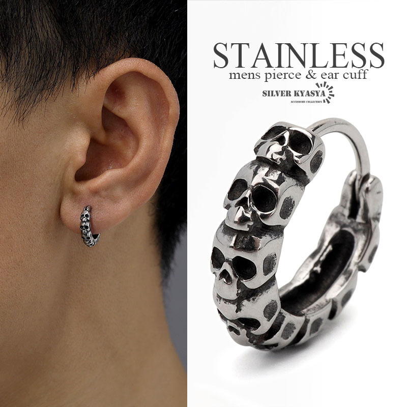 - ステンレス素材 片耳 スカル フープピアス シルバー 髑髏ピアス ワンタッチピアス