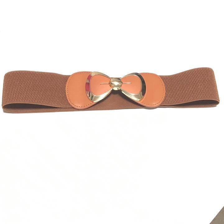 - 【翌日発送】金リボンバックル ★キャメル 幅広ゴムベルト レディースベルト