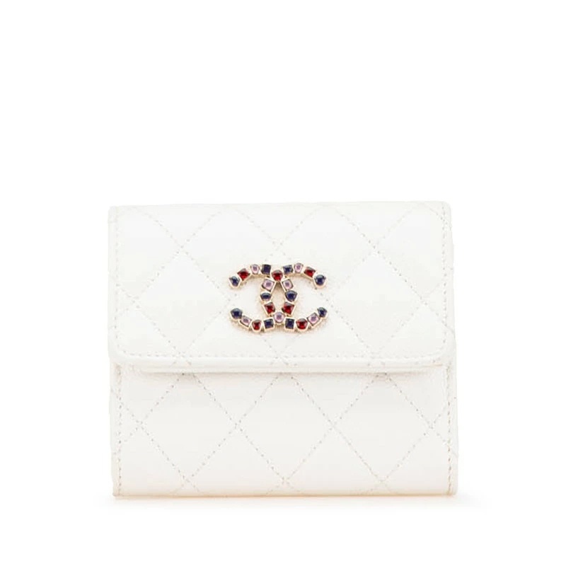 - 中古 シャネル 財布 マトラッセ ココマーク ビジュー 三つ折り ホワイト ラインストーン キャビアスキン CHANEL 【送料無料】【名谷店】