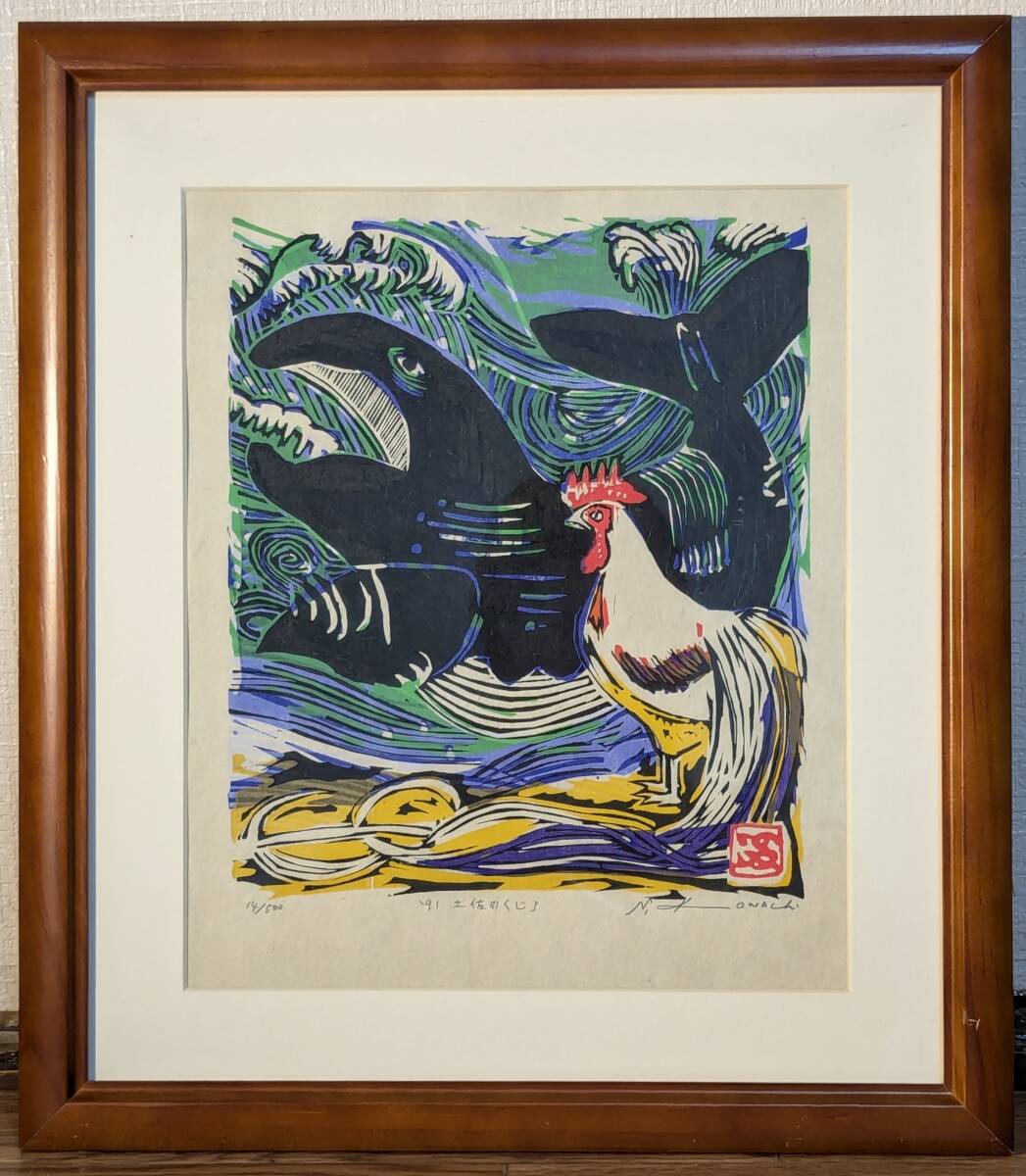 - 【真作】版画 河内成幸 木版画 91土佐のくじら 力強い波と命の象徴 V139