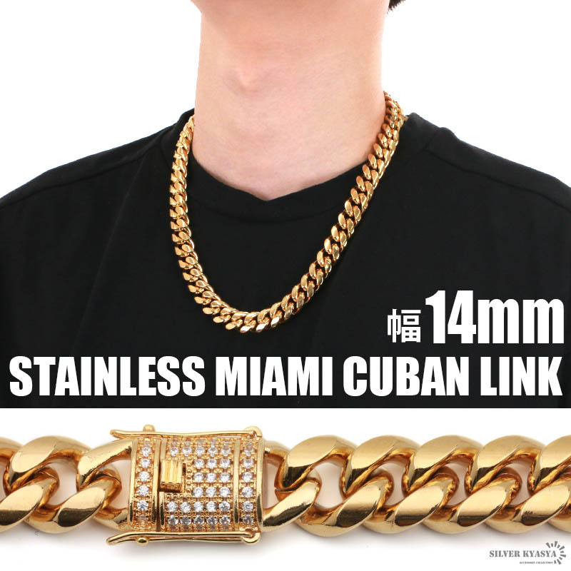 - (24inch(約60cm)) 幅14mm ステンレス 喜平ネックレス CZ パヴェ 二重ロック ゴールド 18k GP