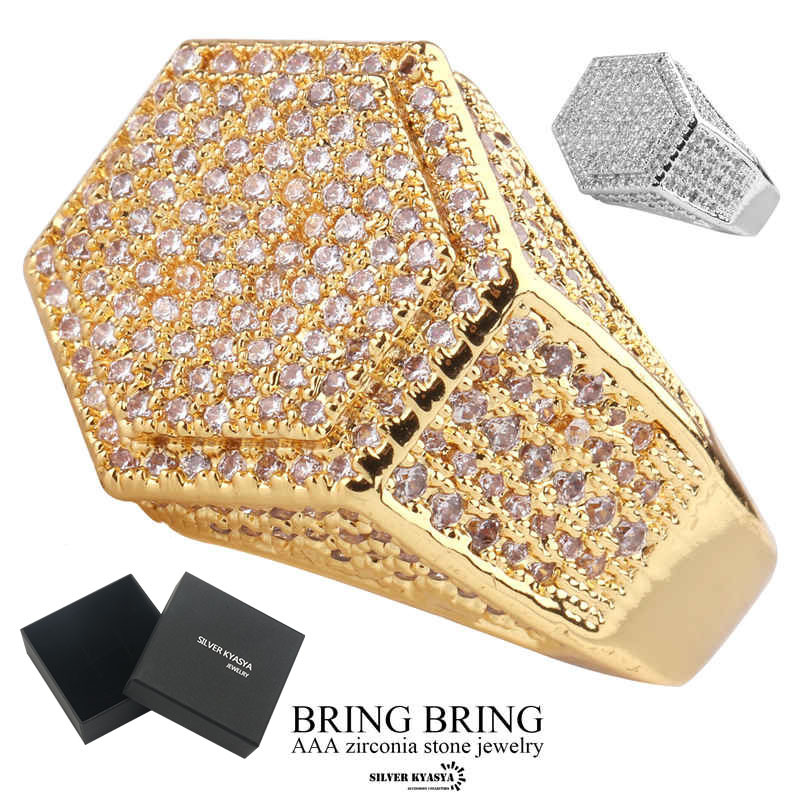 - (ゴールド、24号) ブリンブリン ゴールド リング シルバー 指輪 印台リング 六角形 パヴェ CZ 爪留め 18金 BOX付属