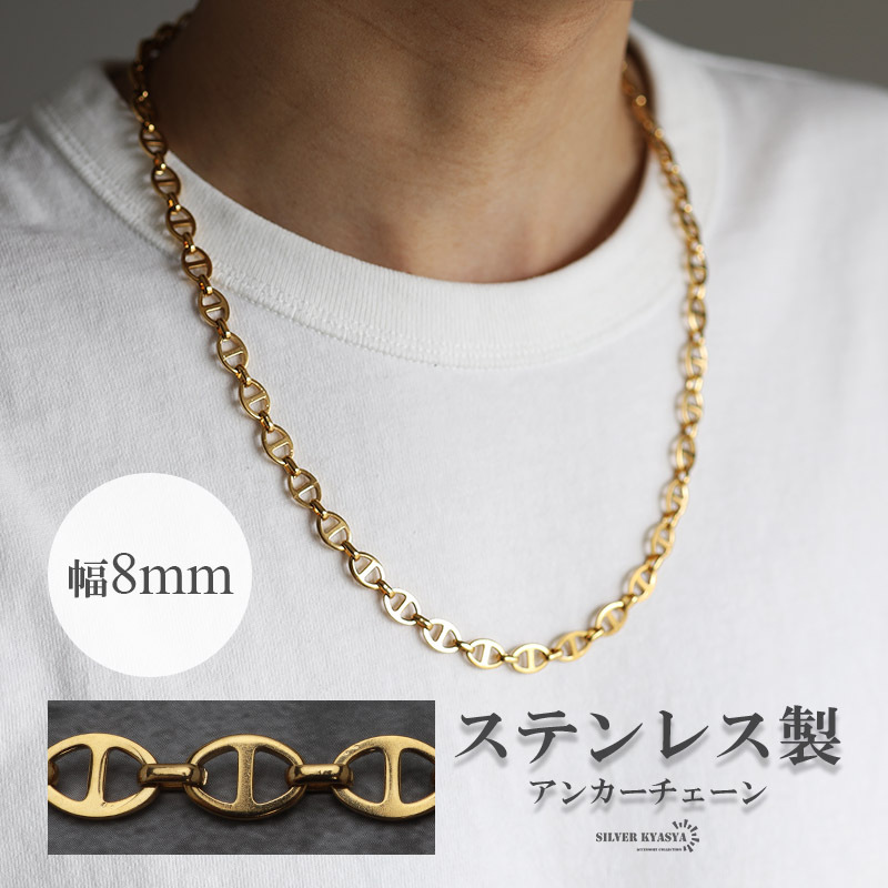- (60cm) アンカーチェーンネックレス 幅8mm ゴールド ステンレス K18 レディース メンズ ネックレス つけっぱなしOK