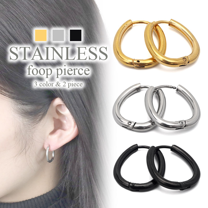 - (ゴールド) ステンレス フープピアス オーバル 楕円 ぷっくり ゴールド シルバー ブラック 黒 両耳用 2点セット