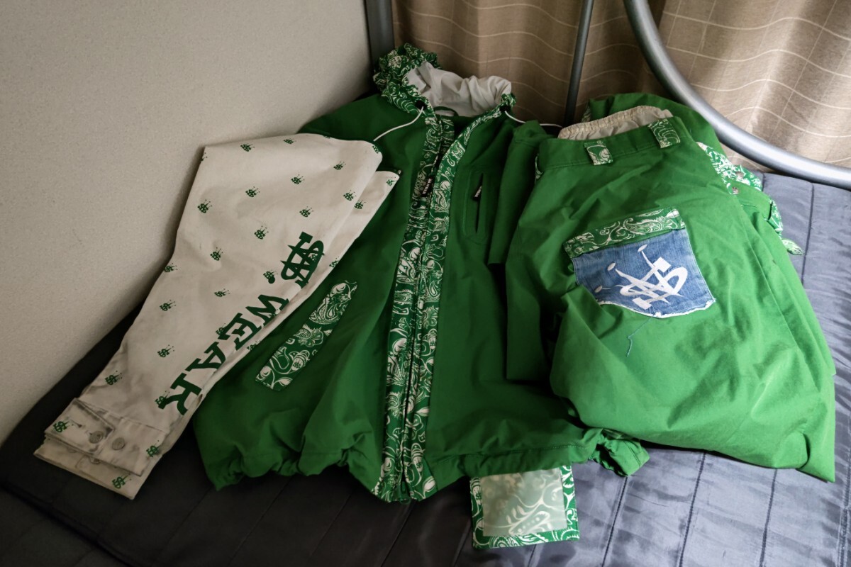 > 中古 S.WEAR S-WEAR S ウェア スノーボード ジャケット スノボ 上下 セットアップ スキー 山 冬 雪 グラトリ パーク ジブ フリー ラン 緑