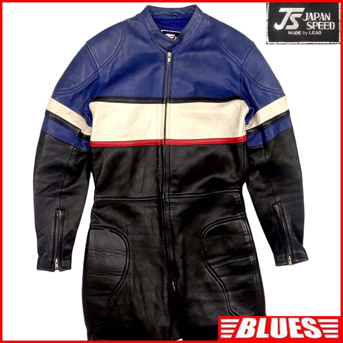 - 即決★JAPAN SPEED★メンズ L レザーレーシングスーツ ジャパンスピード 黒 メッシュ 青 本革 ツナギ 皮 つなぎ ライダースジャケット