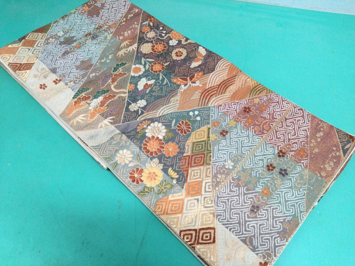 > ● 34 高級 袋帯 カラフル くすみカラー 金 銀 糸 松竹梅 蝶 花 華 波紋 青海波 紗綾形 菱紋 煌 雅 豪華絢爛 六通 帯 中古 ③
