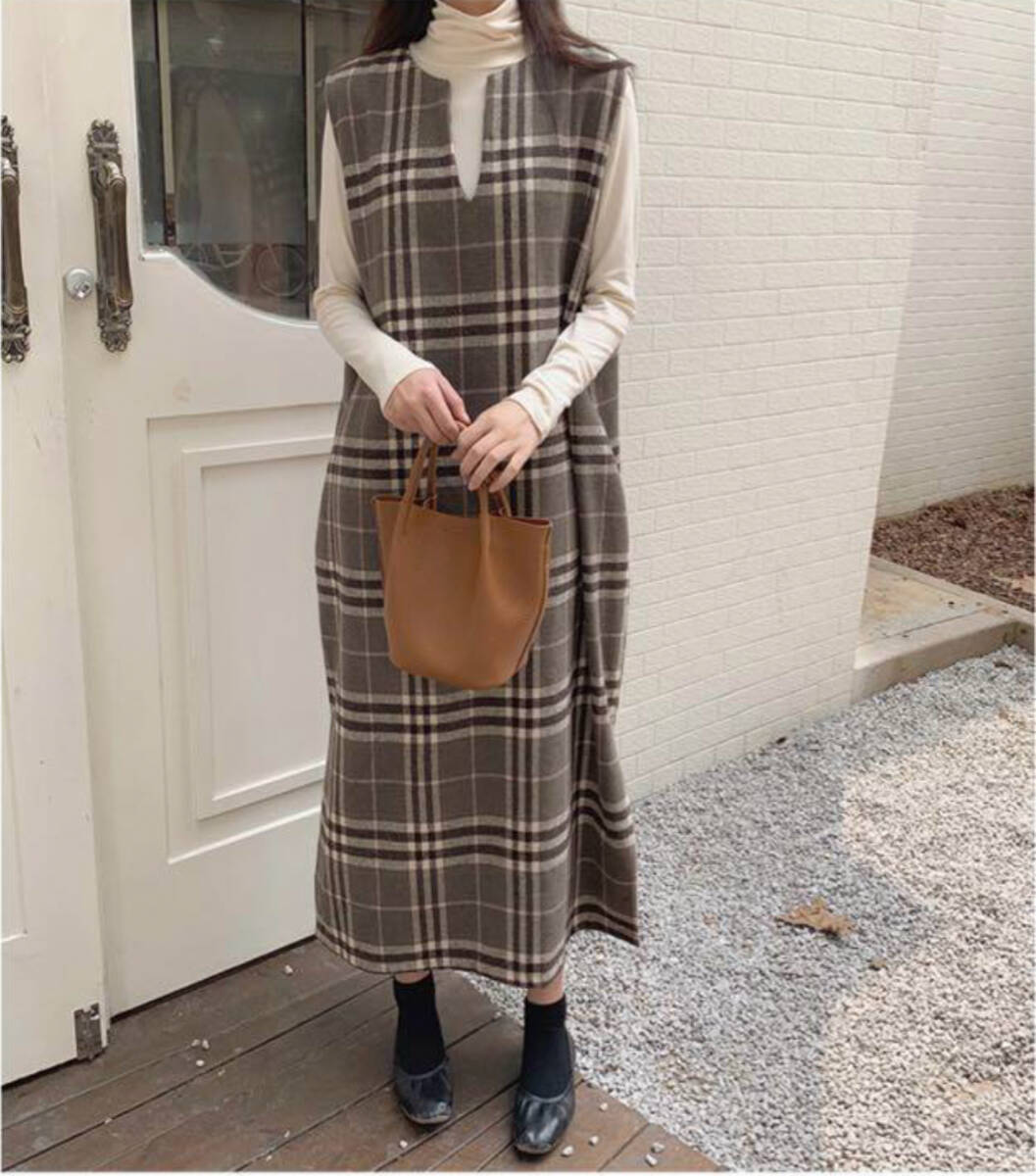 - 【新品】ワンピース ノースリーブ Vネック ロング チェック柄 ブラウン Lサイズ
