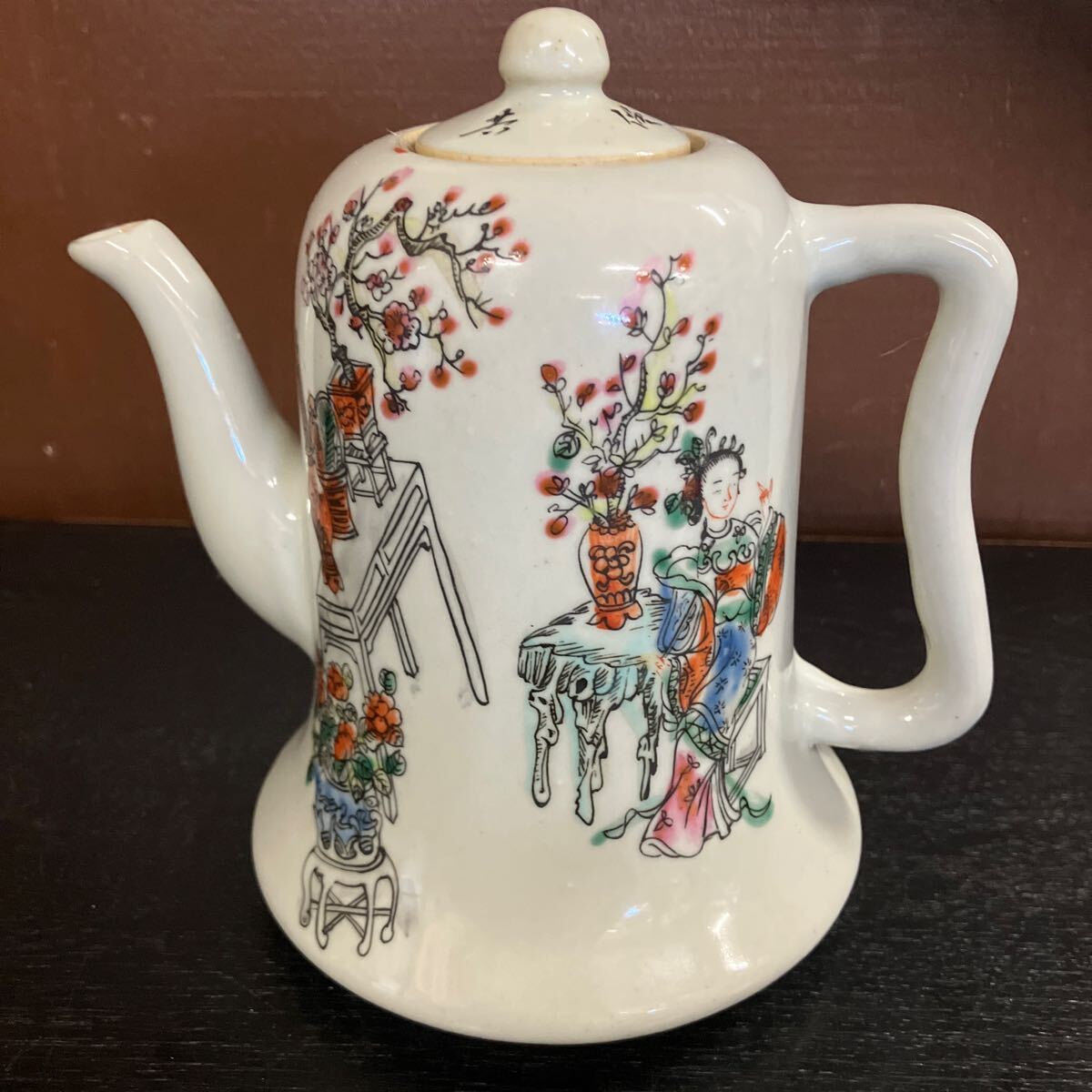 - 中国 アンティーク 漢文美人ティーポット 急須 陶器 高さ約16.5cm