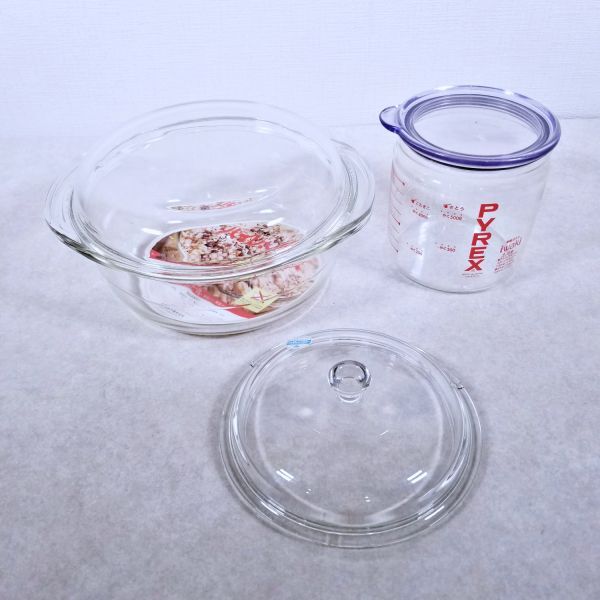- 【最終値下げ】耐熱ガラス PYREX パイレックス まとめて セット キャセロール 蓋付きクリアパック 蓋 電子レンジ可能 120℃ 日本製