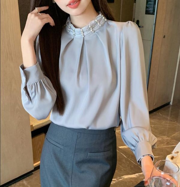 - 人気推薦/サテン シャツ ブラウス オフィス ビジネス フォーマル 卒業式 卒園式 入学式 入園式 着痩せ 通勤 細身 長袖 トップス/ブルー