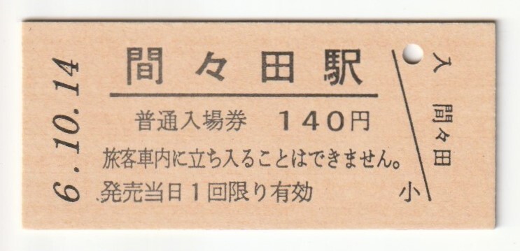 - 平成6年10月14日 東北本線 間々田駅 140円硬券普通入場券(日付印刷)