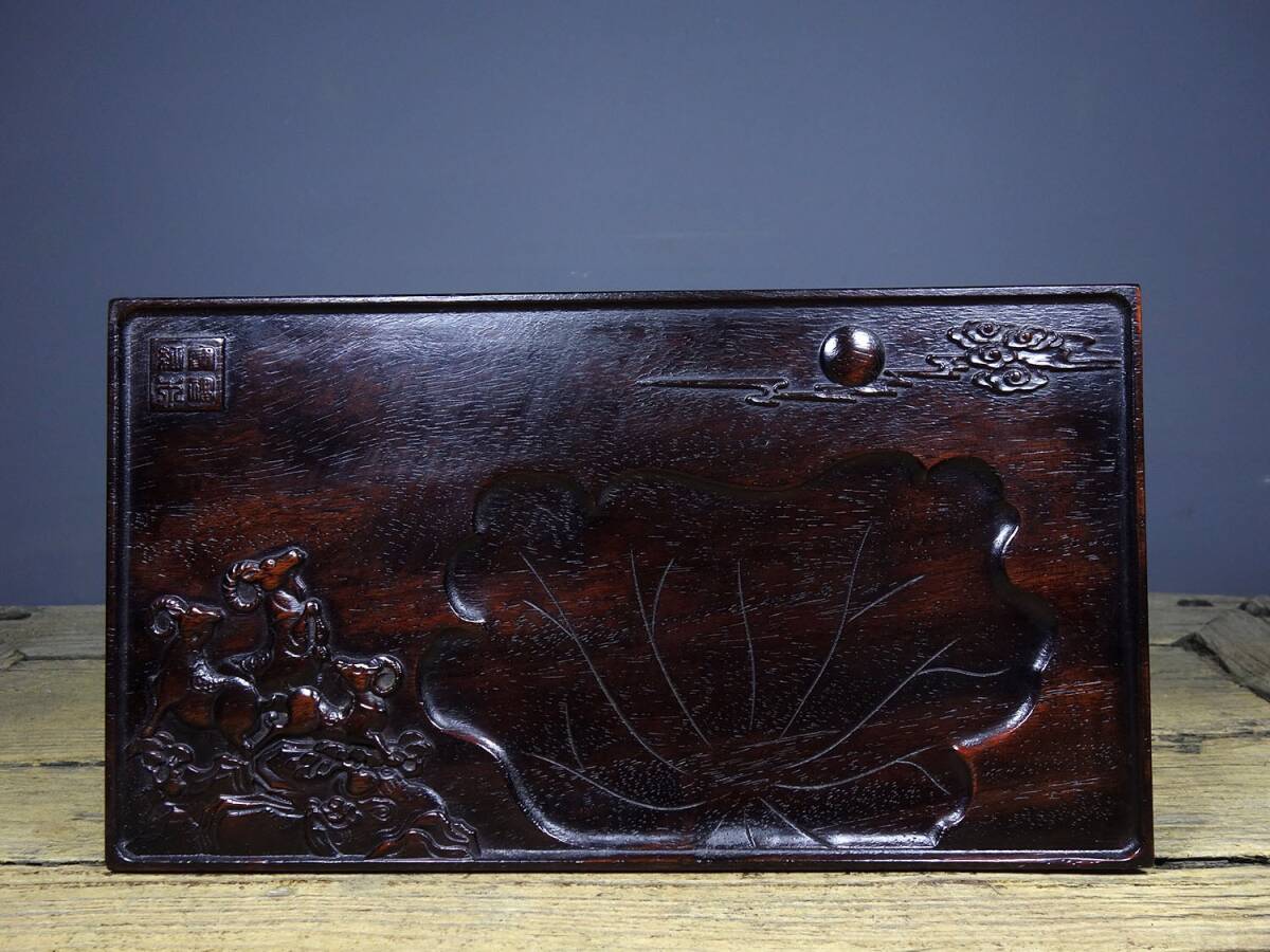 - 【仁】『檀木製・細密彫・三陽開泰紋・茶盤・置物・賞物』極細工 古賞物 中国古玩 古美術 古美味