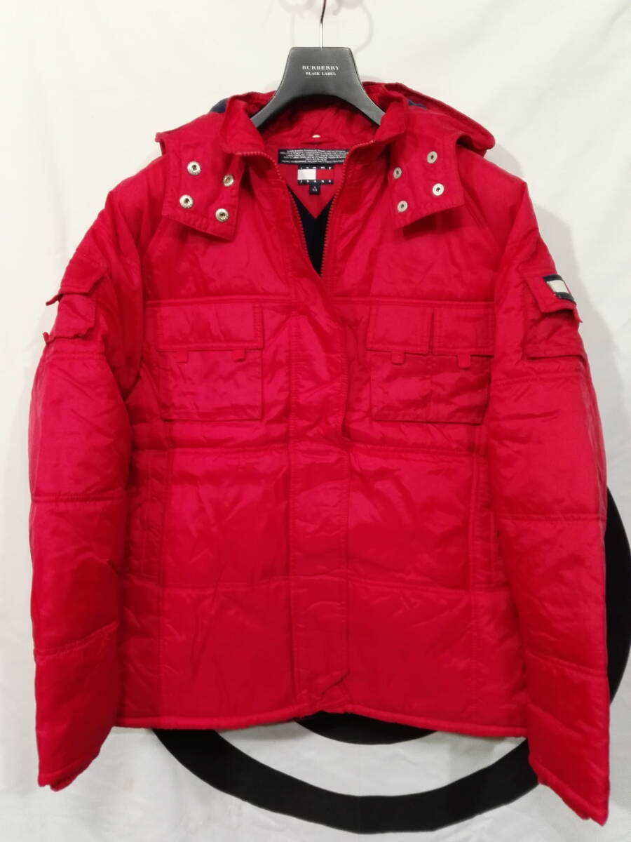 > 90s TOMMY JEANS トミージーンズ ナイロンジャケット フード 中綿入り 裏フリース L レッド HILFIGER ビンテージ 《美品》