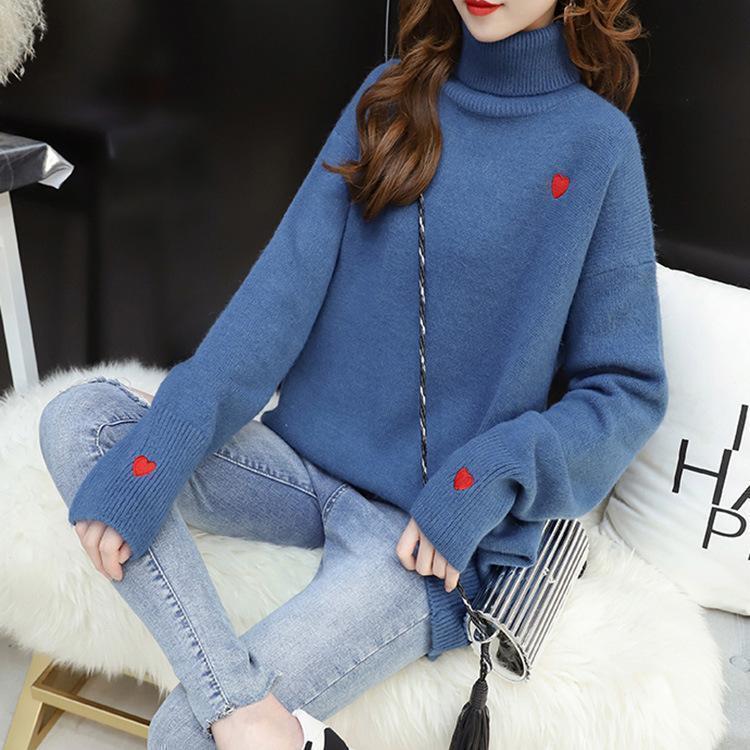 - 【ブルー色★XLサイズ】ハート刺繍 ハイネック セーター ゆったり大きめ