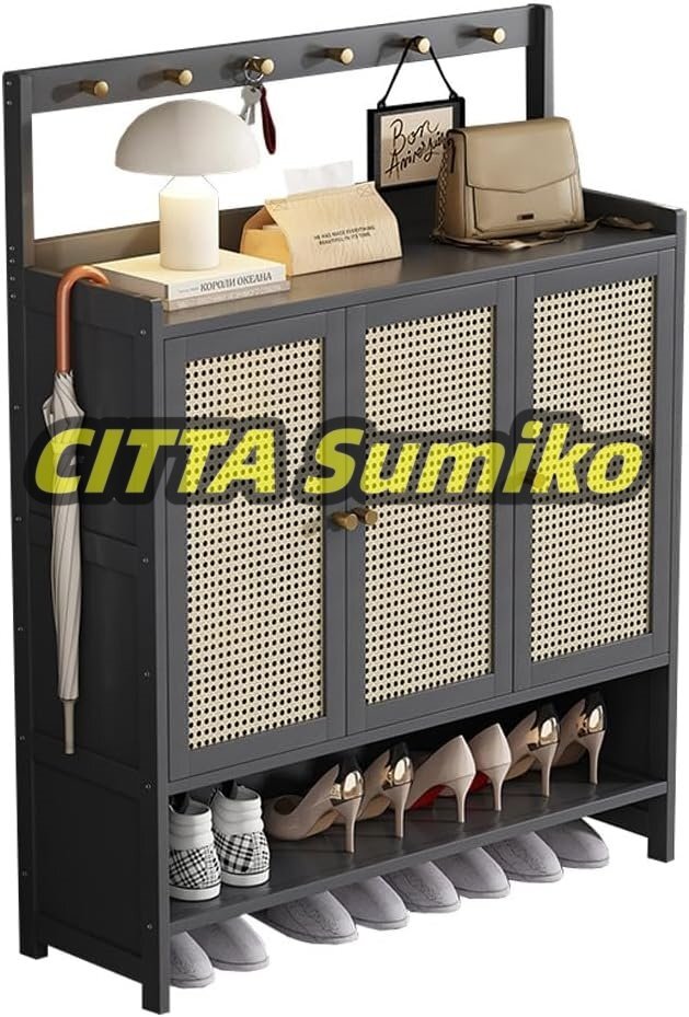 - 籐靴収納キャビネット、靴キャビネット、ドアとフック付き廊下収納ユニット、リビングルーム廊下用スリムシューズラックオーガナイザー