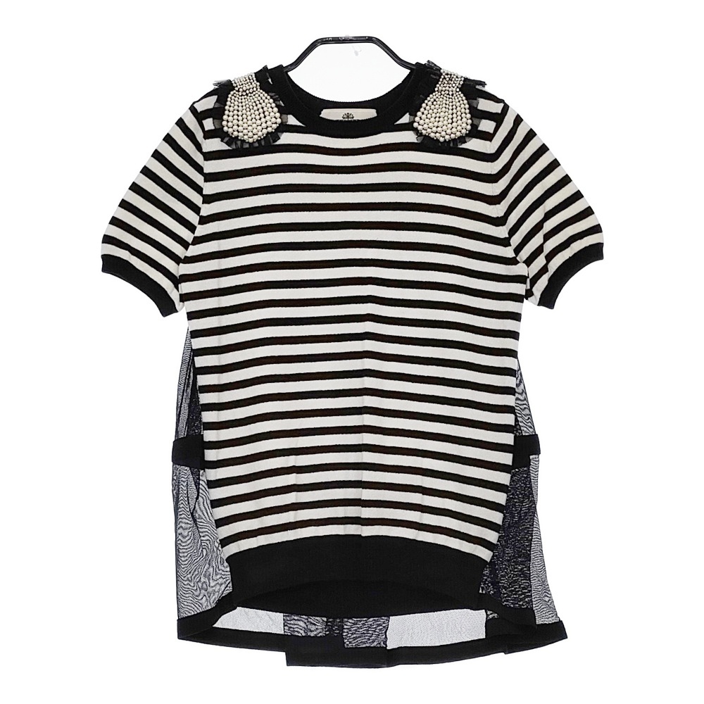 - Kaon 肩パールリボン コットン ボーダー チュール ニット ブラック ホワイト カオン 5-0205S 256281
