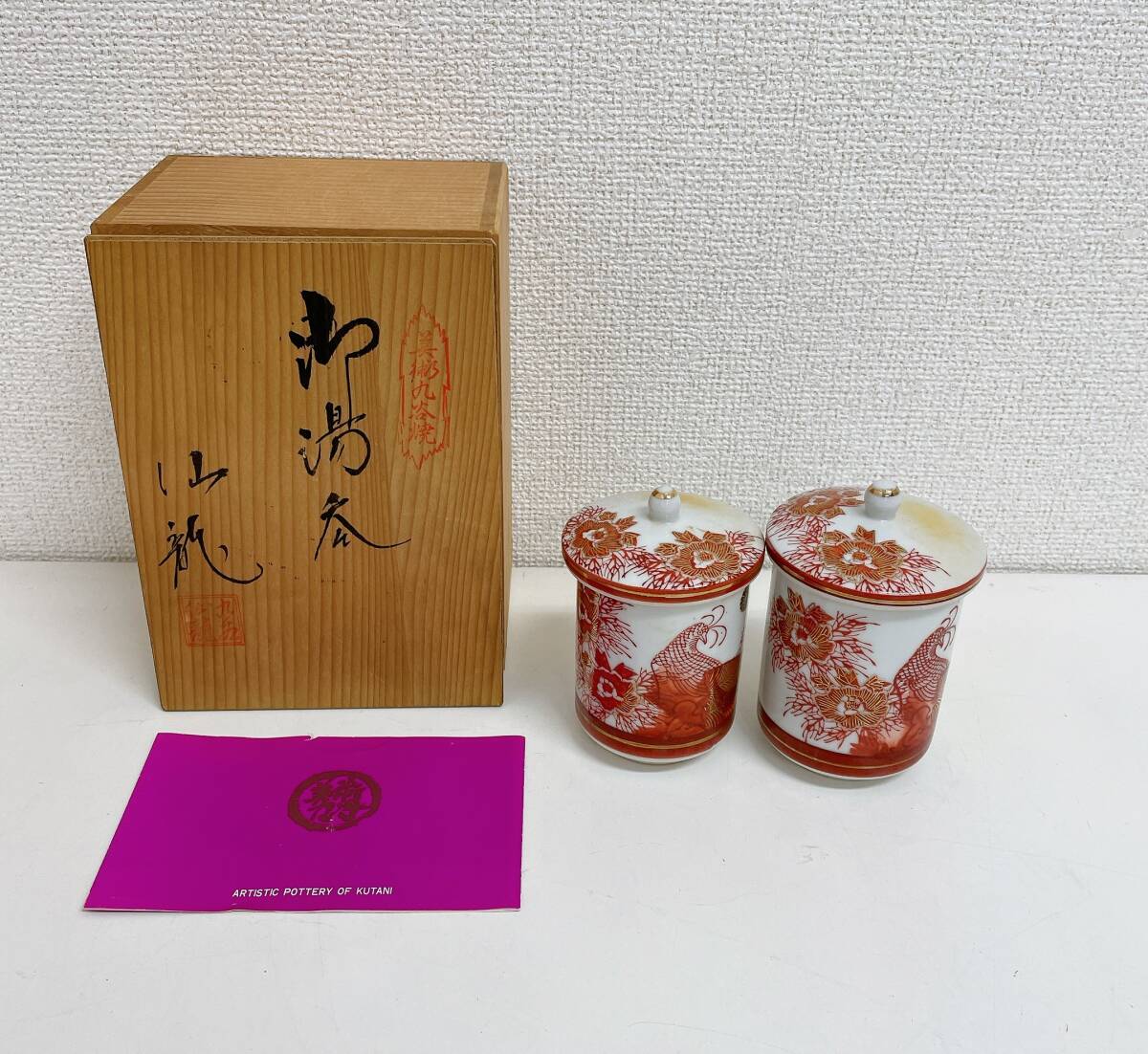 - 【九谷焼 仙龍 夫婦湯呑★】縁起物/鳳凰の絵/華やか/蓋付/共箱付/K71-364