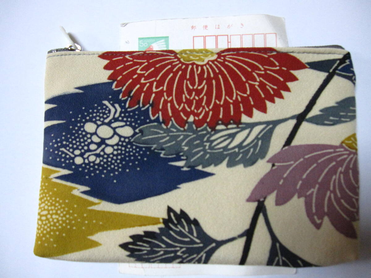 - 手作り 着物リメイク 大 ポーチ 花 菊 模様 華 大柄 ちりめん レトロ ハンドメイド 秋 財布 小物 格安 充電器 眼鏡 男女 兼用 可愛い 幅広