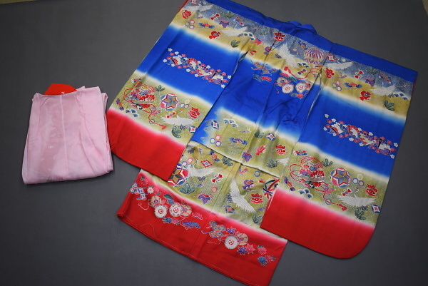 - A32-22【凛々】即決 中古品 正絹 女児 7才用 七五三 着物 青 赤 横段 宝尽くし 鶴 毬 長襦袢付