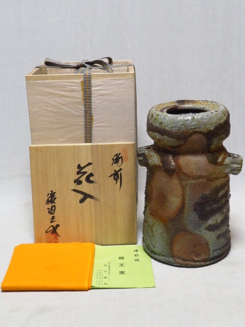 - 備前花入 鈴木勝詞 共箱 共布 栞 双耳花入 花器 花生 備前焼