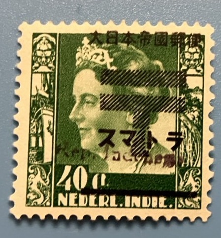 - 南方占領地 切手★オランダ領インド 女王 40c 大日本帝国郵便・インドネシア独立臨時 加刷 右寄り 裏のり ヒンジ跡 未使用