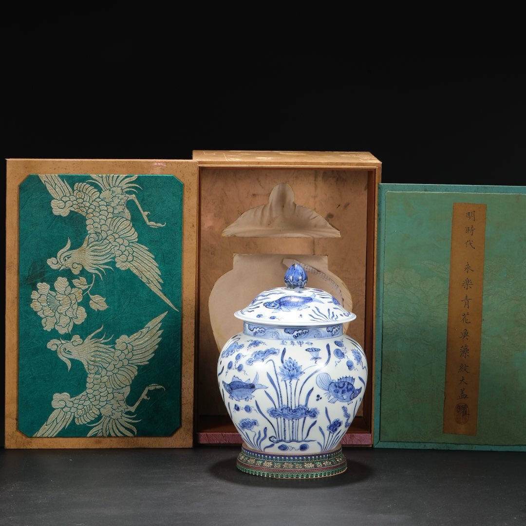 > 明時代 永楽 青花 魚藻文 大蓋罐 唐物 箱付き 陶磁器 中国美術 古美術 置物 高さ28cm 口径14cm 胴径20cm RG131