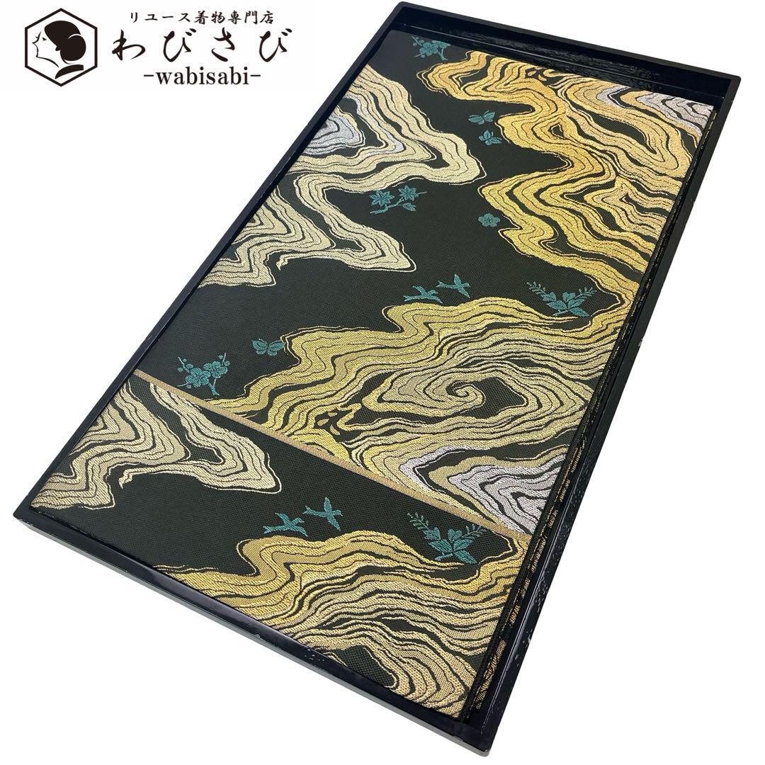 > 袋帯 モダンな霞模様 鳥 蝶々 梅 濡羽色 金銀糸 O-4749 着物 きもの kimono 和服 和装 中古 リサイクル着物 【送料無料】