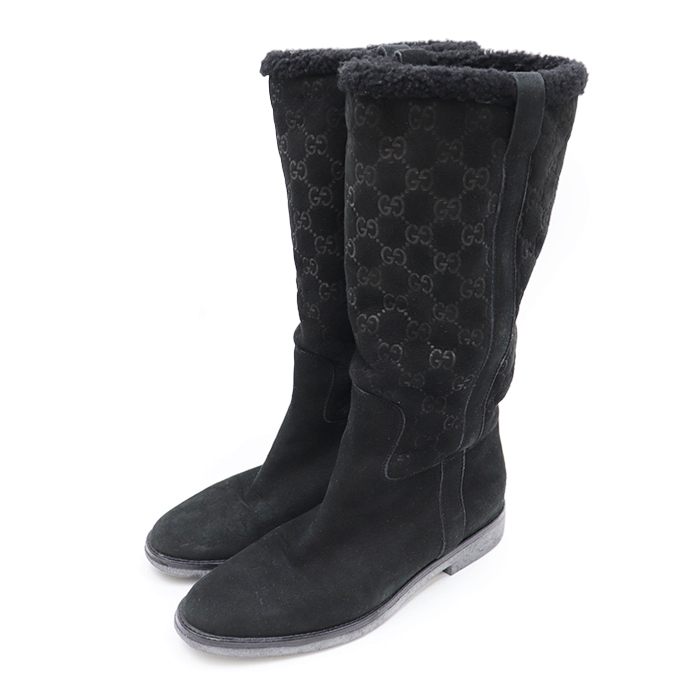 - 【美品】グッチ GG 総柄 エンボス ムートン ペコス ブーツ スエード ボア レディース サイズ 37 ブラック 黒 GUCCI