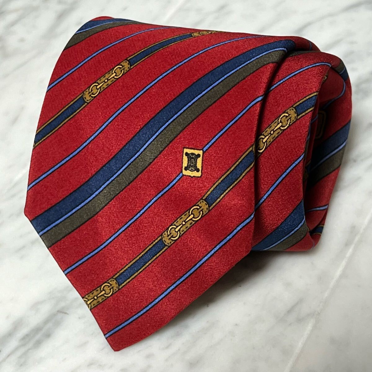 - 999円~ CELINE ネクタイ レッド ストライプ ワンポイントロゴ (R6)