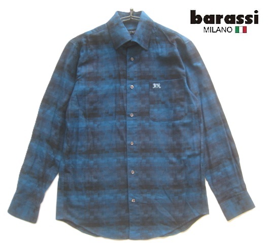 > 美品日本製!!バラシ barassi*ロゴ刺繍 デジタルチェック柄隠しボタンダウンシャツ 紺×黒 46 実寸M ネイビー×ブラック